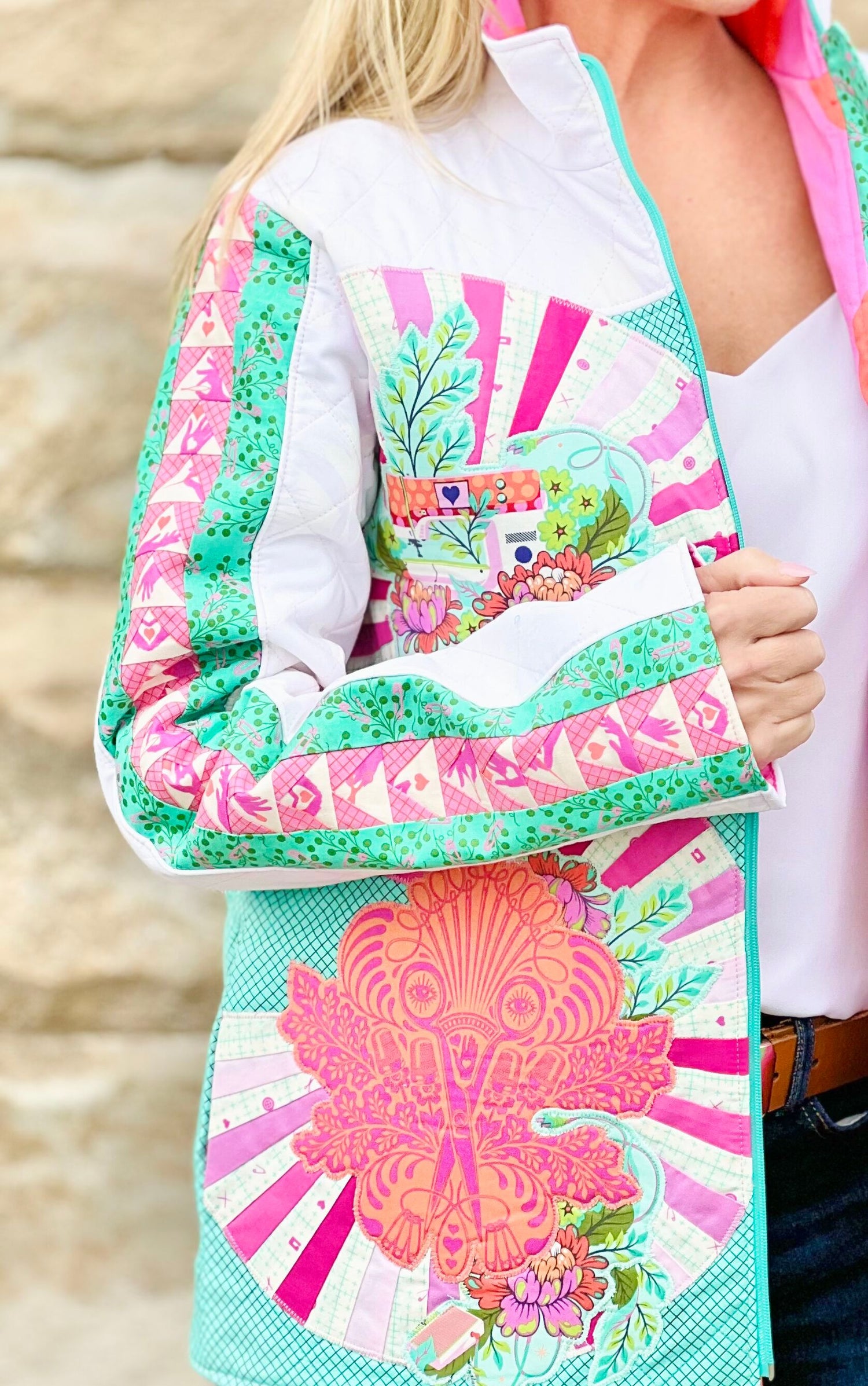 Join Elissa, as she shares her approach to creating quilted clothing, creating a new unique design from the ground up, loaded with color,applique, and paper piecing. Participants will gain valuable insight in how to approach construction with tips and techniques, choosing supplies for a polished and wearable finish, and what to consider in their own quilted garments.